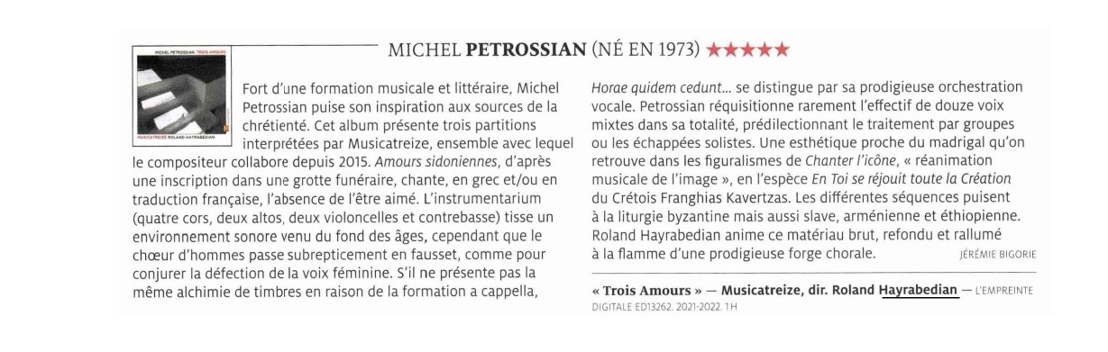 Fort d'une formation musicale et littéraire, Michel Petrossian puise son inspiration aux sources de la chrétienté. Cet album présente trois partitions interprétées par Musicatreize, ensemble avec lequel le compositeur collabore depuis 2015.Amourssidoniennes,d'après une inscription dans une grotte funéraire, chante, en grec et/ou en traduction française, l'absence de l'être aimé. L'instrumentarium (quatre cors, deux altos, deux violoncelles et contrebasse) tisse un